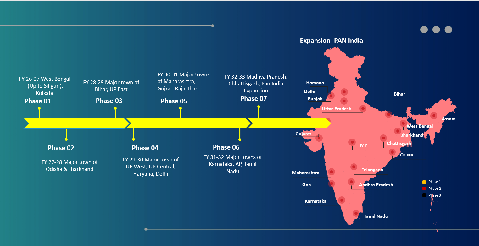 Our growth strategy is designed as a phased, region-wise expansion across India, ensuring strong local presence, operational scalability, and sustainable customer adoption at every stage. By prioritizing high-potential markets first and expanding systematically, we are building a solid foundation for long-term national reach.